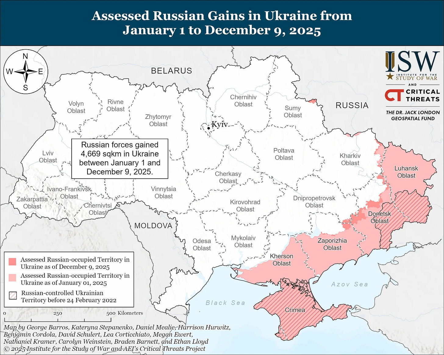 La lentezza degli avanzamenti emerge con ancora maggiore chiarezza quando si osserva la loro distribuzione spaziale. Le mappe che confrontano il controllo territoriale nel tempo – come quella dell’ISW riportata qui sotto, relativa al 2025 – mostrano che i progressi russi sono frammentati e concentrati in aree specifiche, senza produrre una riconfigurazione complessiva del fronte.