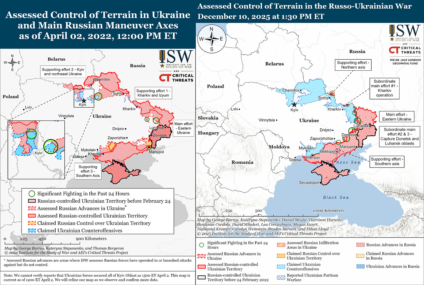 Il confronto tra la mappa dei territori occupati nella primavera del 2022 — quando Mosca tentava una guerra di manovra rapida, con avanzate su più assi e penetrazioni profonde nel territorio ucraino, fino alle porte di Kyiv — e quella di dicembre 2025 racconta efficacemente la dinamica del conflitto.