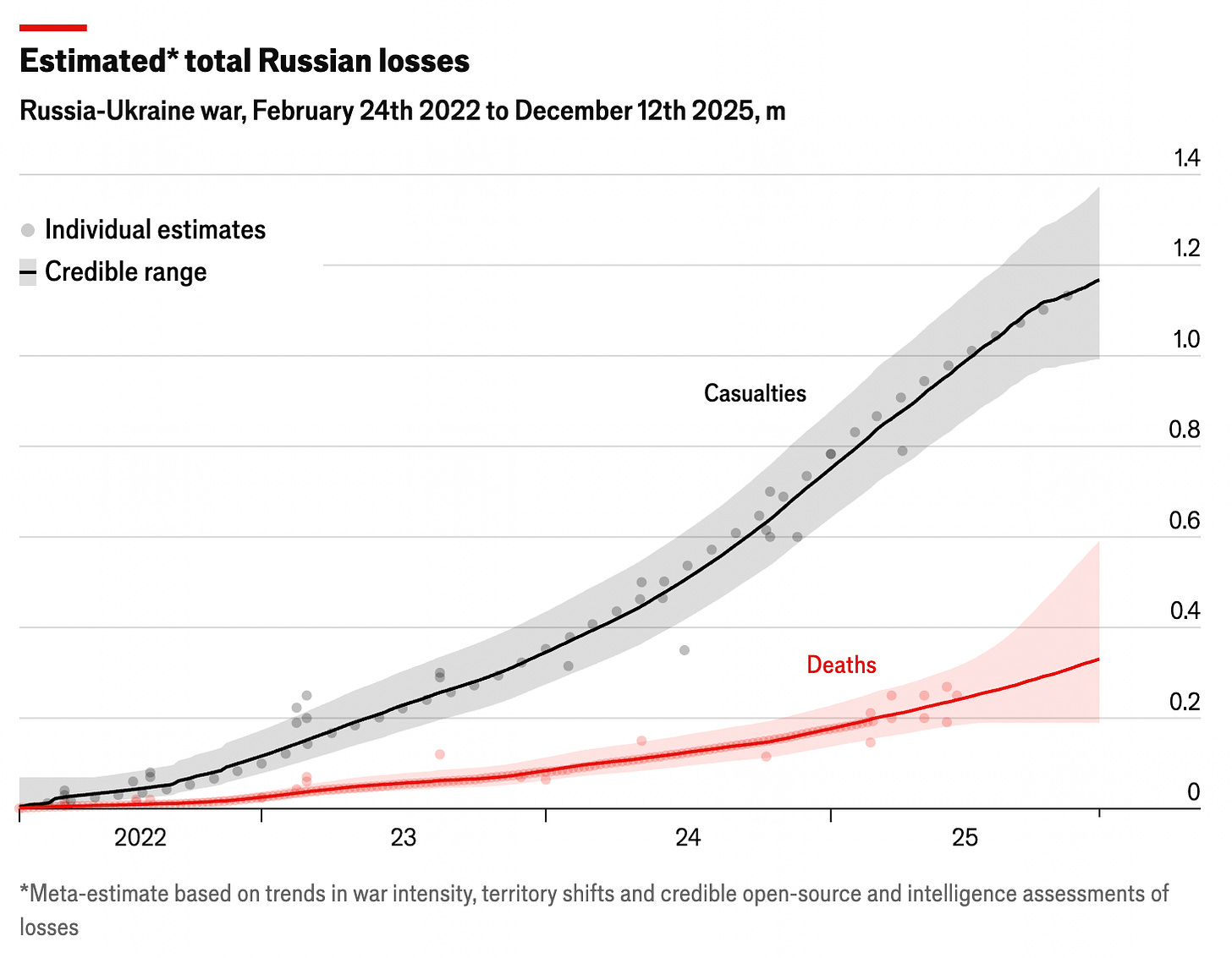 Il nodo di una guerra di logoramento è capire chi viene logorato più rapidamente. Il grafico sulle perdite russe cumulate riportato sotto, ricostruito dall’Economist a partire da fonti OSINT e valutazioni di intelligence, chiarisce ulteriormente il quadro. Pur con tutte le cautele necessarie — si tratta di stime, non di bilanci certificati — è utile concentrarsi sulla dinamica anziché sui valori puntuali: le fonti più autorevoli convergono su ordini di grandezza molto elevati, con una crescita quasi monotona delle vittime nel tempo.