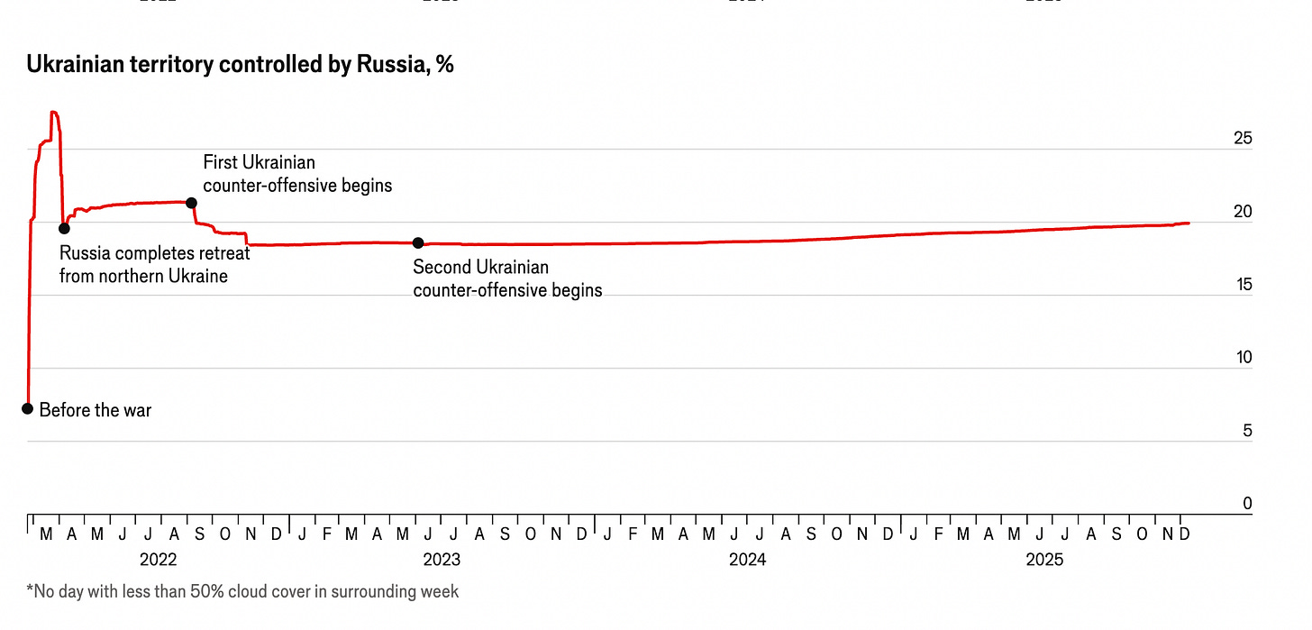 Il grafico qui sotto, basato su dati ISW rielaborati dall’Economist, mostra con chiarezza questa dinamica. Dopo il picco iniziale dell’occupazione russa nel 2022 e il successivo arretramento dovuto alle controffensive ucraine, la curva si appiattisce. Dal tardo 2022 in poi, la quota di territorio ucraino controllata dalla Russia cresce lentamente, nell’ordine di alcune migliaia di chilometri quadrati (meno dell’uno per cento del territorio ucraino) senza mai avvicinarsi ai livelli raggiunti nella fase iniziale dell’invasione.